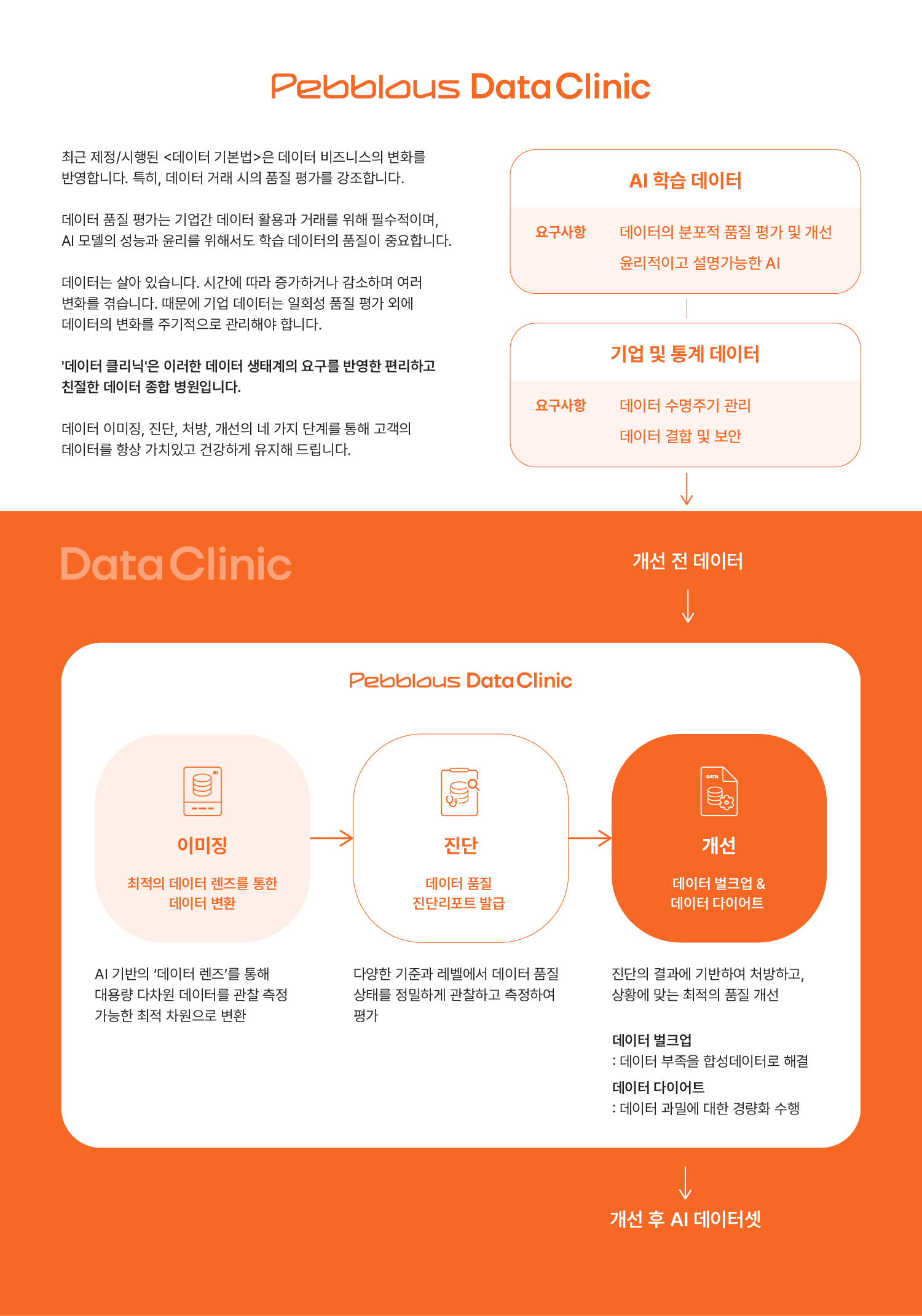 페블러스 데이터 클리닉은 데이터 수명주기 관리에 필수적인 다양한 서비스를 진단리포트와 함께 제공합니다. 데이터 품질 진단과 개선, 두 데이터셋의 품질 비교 등 첨단의 데이터 클리닉 서비스를 경험하세요.