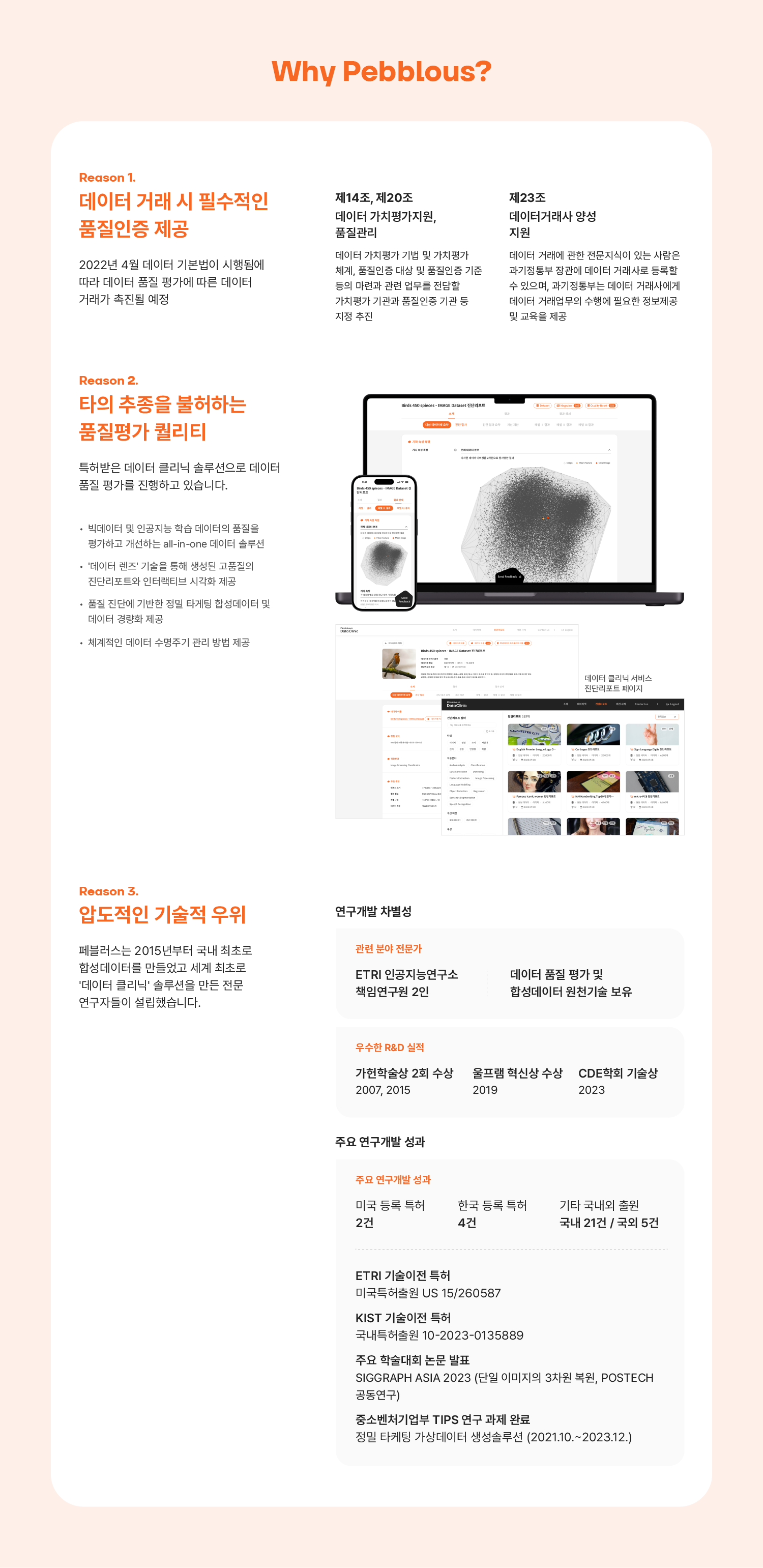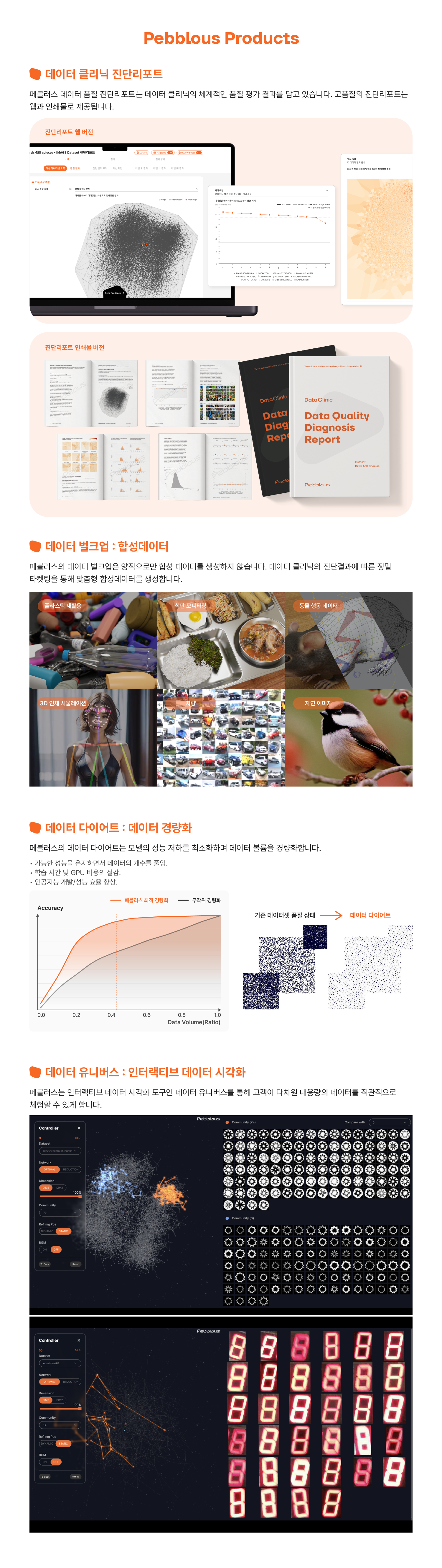 페블러스는 고객이 보유한 AI 모델의 성능 향상을 위해 맞춤형 합성데이터를 생성하여 제공합니다. 실제 데이터가 부족하거나, 민감한 정보를 다루거나, 획득 비용이 높은 경우에 합성데이터를 활용하는 것은 AI 훈련에서 매우 효과적인 전략입니다. 특히 페블러스는 데이터 클리닉의 진단을 통해 특정 요구에 맞는 정밀 타겟 합성데이터를 제공합니다.